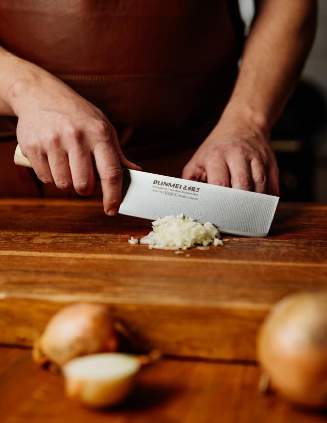 Bunmei utvider familien med en nakiri – en klassisk japansk grønnsakskniv. Det nesten rektangulære bladet skjærer rett gjennom grønnsakene uten at du trenger å dra eller skyve. Det gir deg full kontroll over hvert snitt. Kniven er ideell til intensiv hakking, eller når du vil unngå å skjære inn i roten på løken.