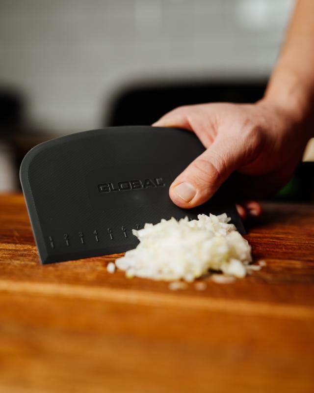 Deigskrape fra Global i fleksibel plast skjærer og deler deigen i jevne stykker ved hjelp av en praktisk måleskala. Den følger skjærefjølen perfekt, samler opp smuler og fungerer også som benkskrape. Den gjør jobben både raskere og morsommere. Med en bredde på 15 cm er den kompakt, men effektiv – en liten kjøkkenassistent som gir full kontroll på benken.