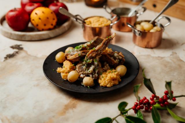 Saftig og smakfull – Øyvinds pinnekjøtt kokes langsomt til det er mørt, og serveres så med kålrotstappe og herlig løksjy. En klassiker på julebordet.