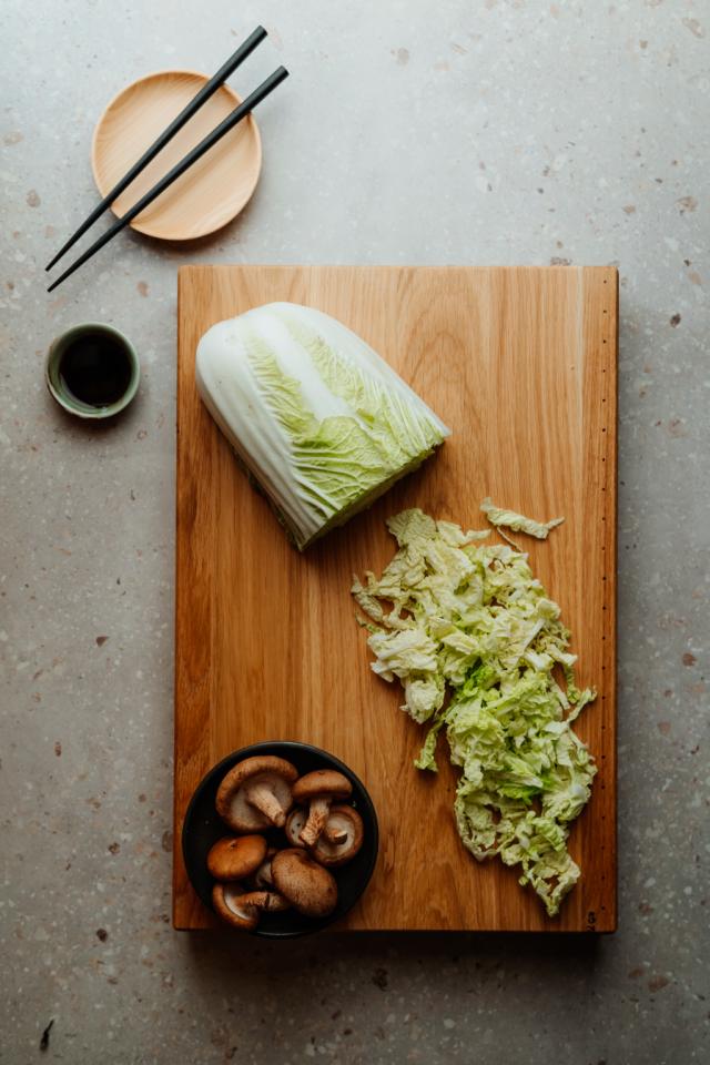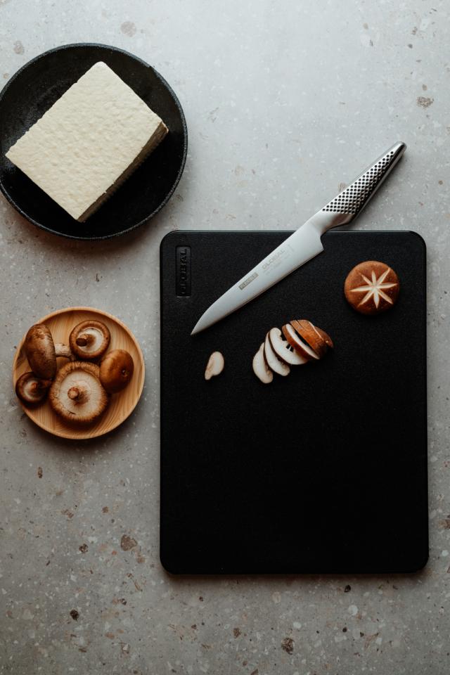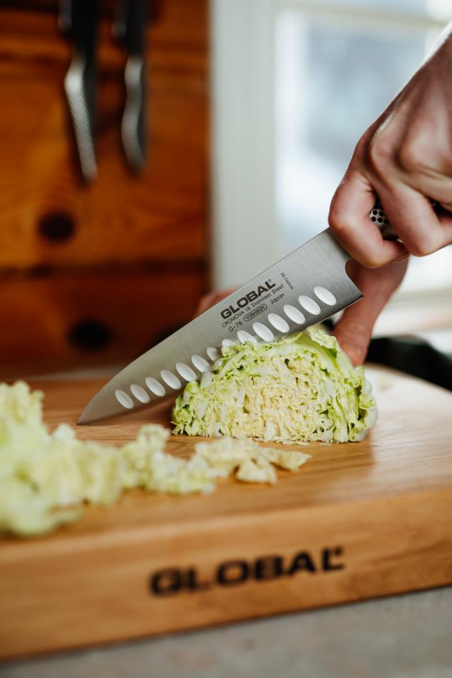 Ulltøy ute – riktig underlag inne. Globals skjærebrett i eik er slitesterkt, skånsomt mot kniven og har en stabil tyngde du kan stole på.