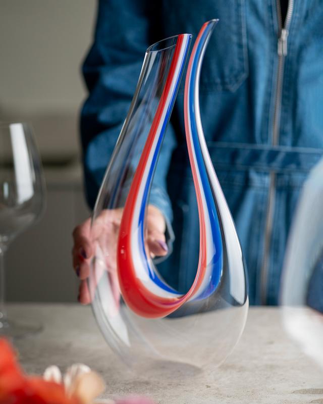 En av Riedels mest populære dekantere er uten tvil den vakre Amadeo, med et design inspirert av en harpe, der den smale delen fungerer som helletut. Amadeo ble lansert i 2006 og har gjennom årene kommet i flere ulike utgaver. Sist inn i sortimentet er to nordiske versjoner med striper i Norge og Sveriges farger – perfekt til nasjonaldagen!