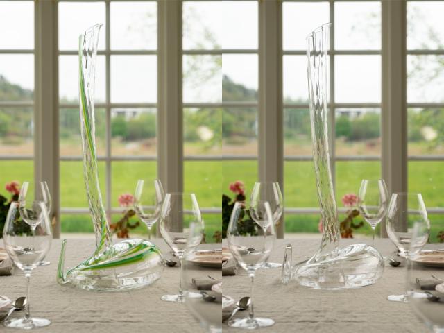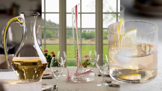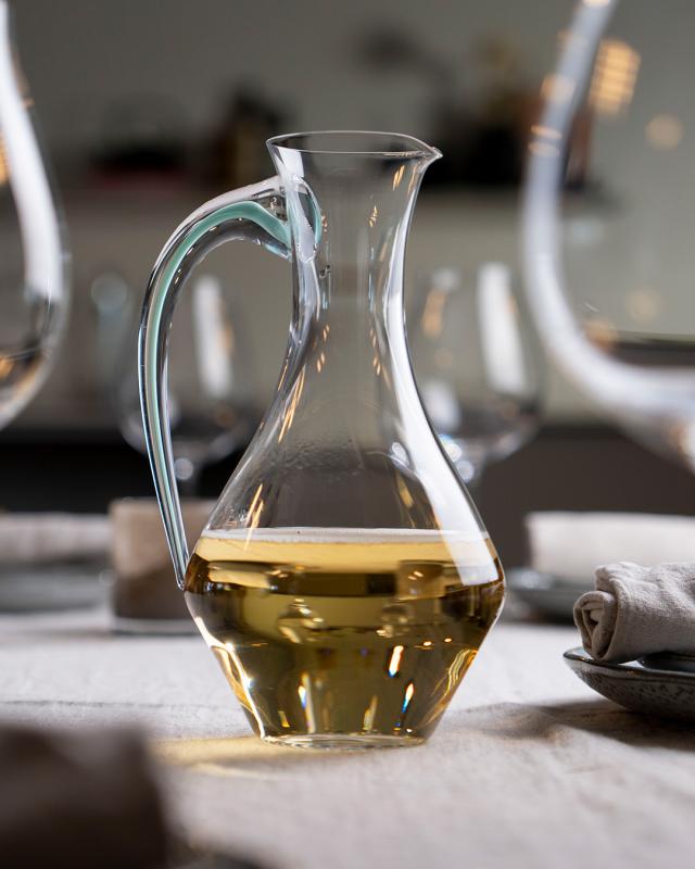 Denne høsten lanserer Riedel vinkarafler i matchende design. Her har Riedel tatt utgangspunkt i den klassiske karaffelen Cabernet og formet nye modeller med helletut og munnblåst håndtak. Det er de dyktige glassblåserne i Riedels glasshytte i Østerrike som skaper, farger og monterer alle delene. På den måten blir hver karaffel et unikt håndverk. Velg mellom vanlig størrelse og magnum, med håndtak i gult eller turkis for å komplettere høstens borddekking.
