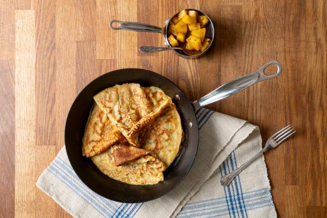 Pannekaker + ananas = sant. Mørk rom brukes når ananasen flamberes. Dette gir retten en tropisk friskhet og en subtil, karamellisert sødme – den perfekte balanse mellom det syrlige og det dype.