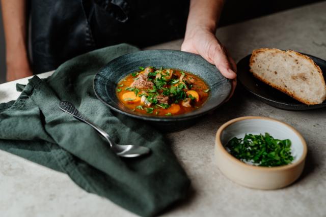 Når kjøttet er mørt, ta gryten av varmen og smak til med salt og pepper. Finhakk persille og ha i. Server med ferskt brød!