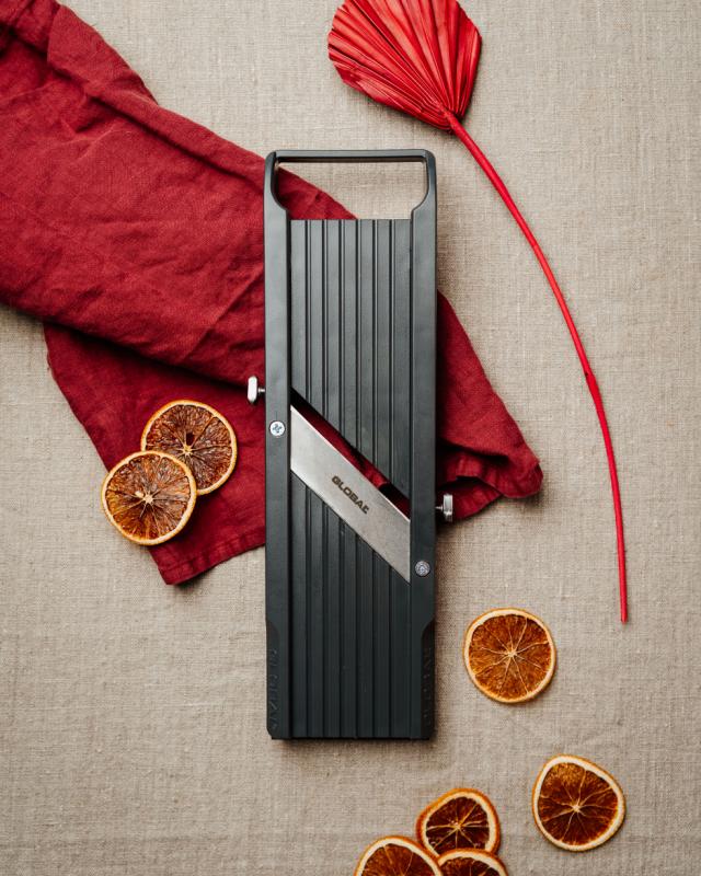 En favoritt blant kokker og konditorer! Med Globals mandolin kan du superenkelt skjære grønnsaker og marsipan helt ned til 0,5 mm. Den ultimate julegaven til den som vil ta neste steg på kjøkkenet.