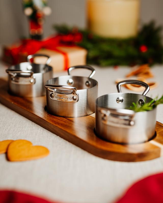 Alle gode ting er tre – det gjelder også på kjøkkenet. Tre vakre minigryter i rustfrittstål som passer perfekt til servering av sauser og tapas. Med et tilhørende trefat for en vakker borddekking.