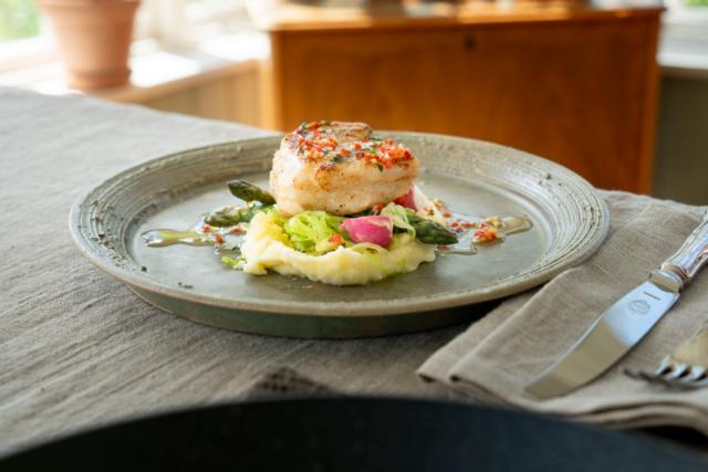 Pannestekt lysing med brunet smør og dampede grønnsaker