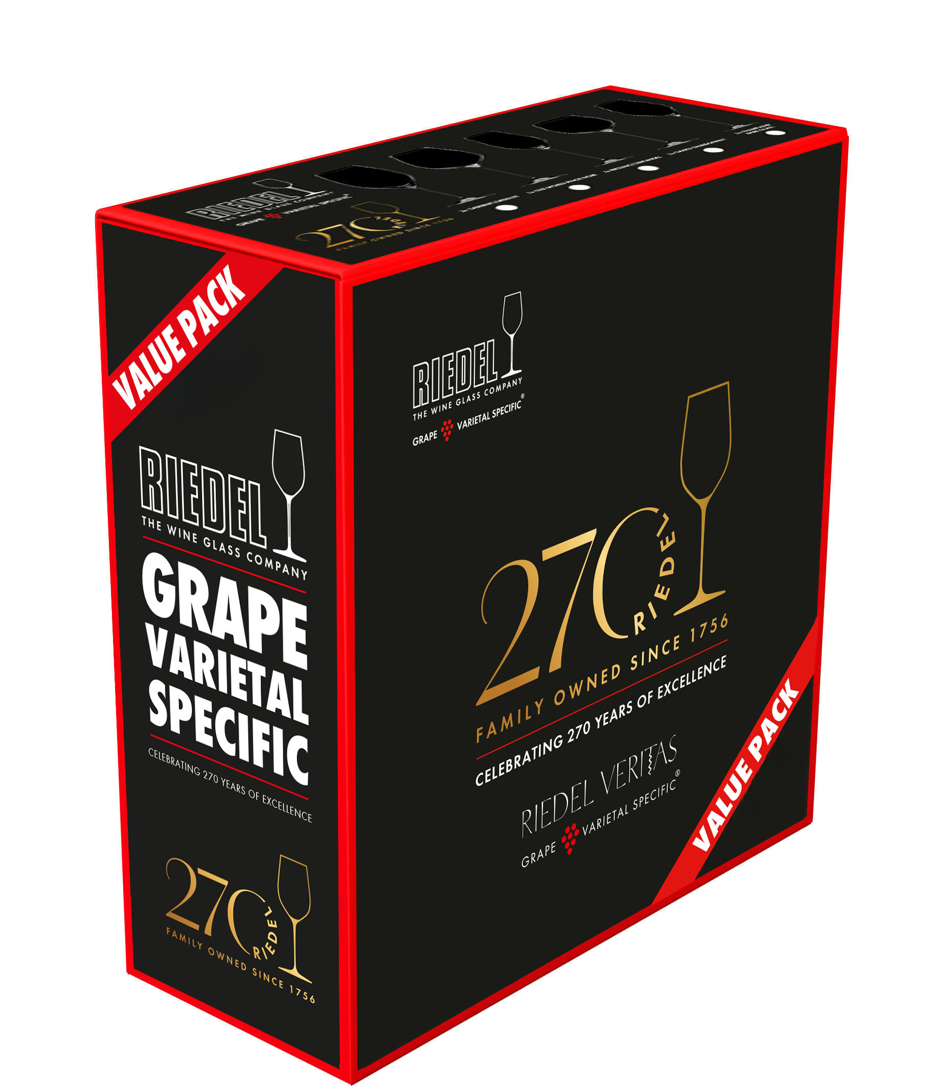Glassene inngår i Riedels jubileumskolleksjon. Som en del av 270-årsfeiringen har Riedel pakket om noen av sine populæreste produkter i festlige pakker.